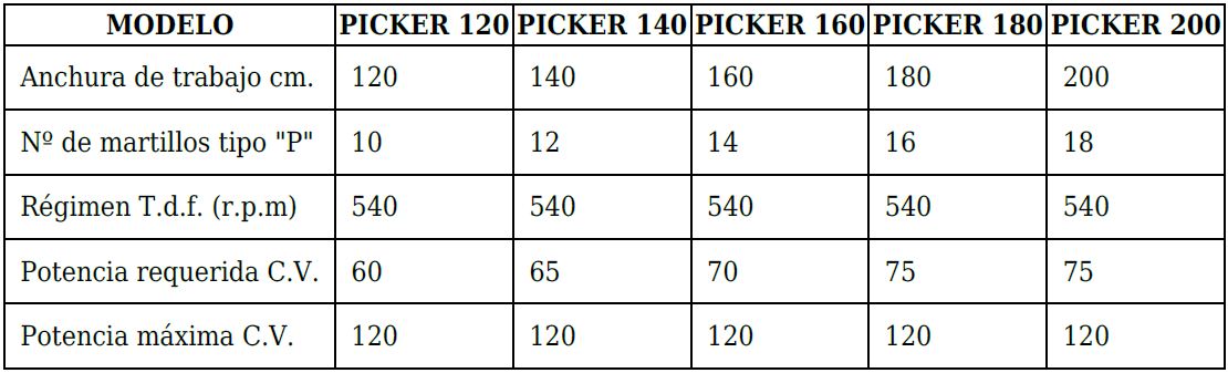 Trituradora para sarmientos de poda, formada por un pick-up delantero para elevar y transportar el material y un rotor triturador para picar el material. La trituradora PICKER puede trabajar en todo tipo de terrenos, incluidos los pedregosos en los cuales no es posible trabajar con las máquinas tradicionales ya que, como el triturado se efectúa muy cerca del suelo, el rotor triturador se podría desequilibrar y romper; en el modelo PICKER el picado se efectúa en una cámara que queda en una posición más elevada con respecto al suelo, y, por lo tanto, el rotor no llega a tocar las piedras, la arena, la hierba ni ningún otro material.