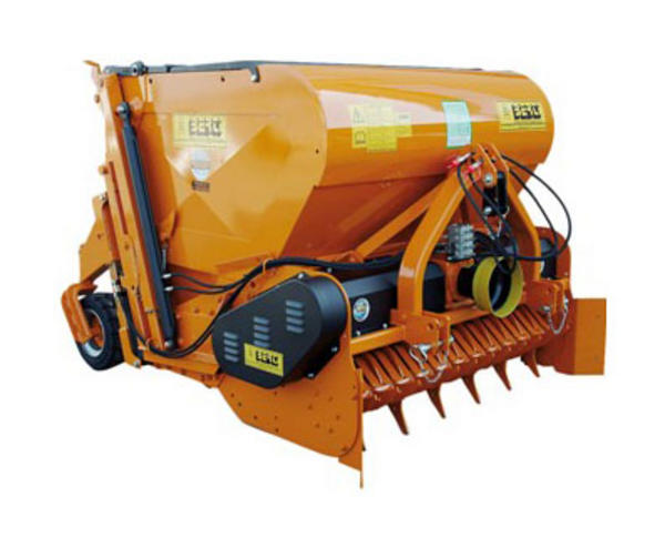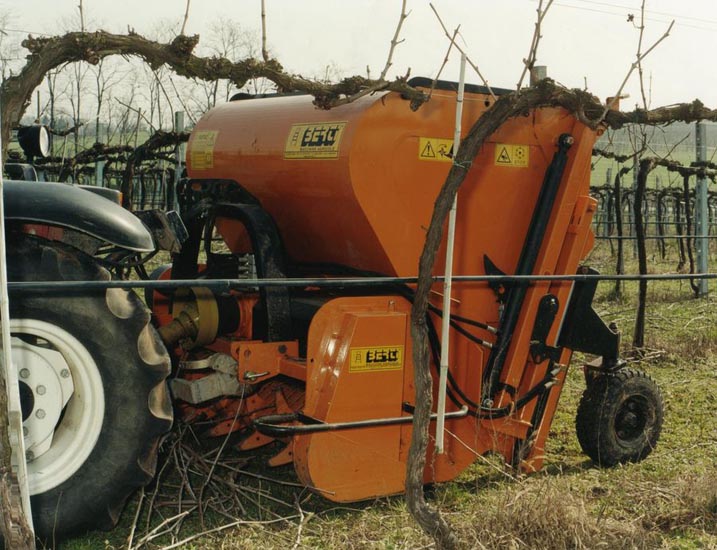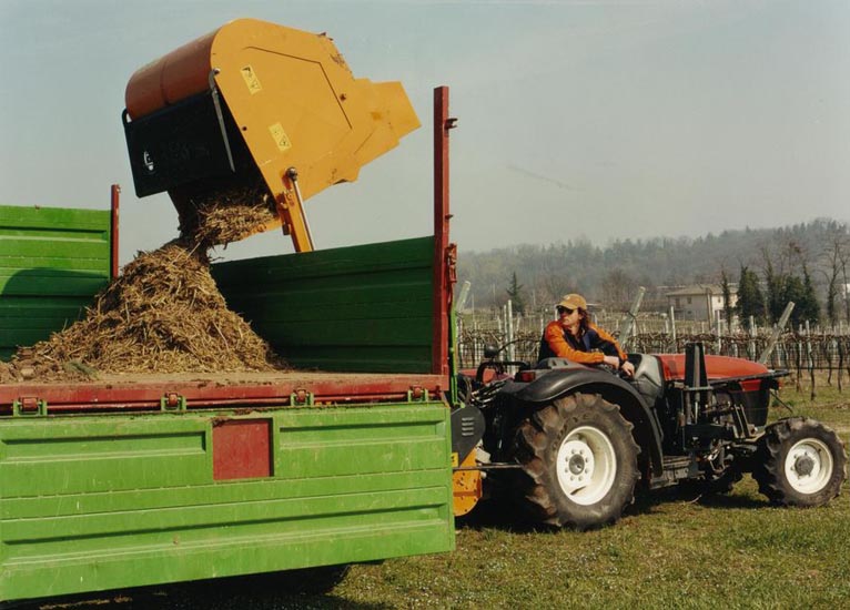 Trituradora para sarmientos de poda, formada por un pick-up delantero para elevar y transportar el material, un rotor triturador para picar el material y un recogedor para almacenar el material picado. La trituradora puede trabajar en todo tipo de terrenos, incluidos los pedregosos en los cuales no es posible trabajar con las máquinas tradicionales ya que el rotor triturador se podría desequilibrar y romper; en esta máquina, el picado no se efectúa en contacto con el suelo sino en una cámara especial, sin tocar las piedras.