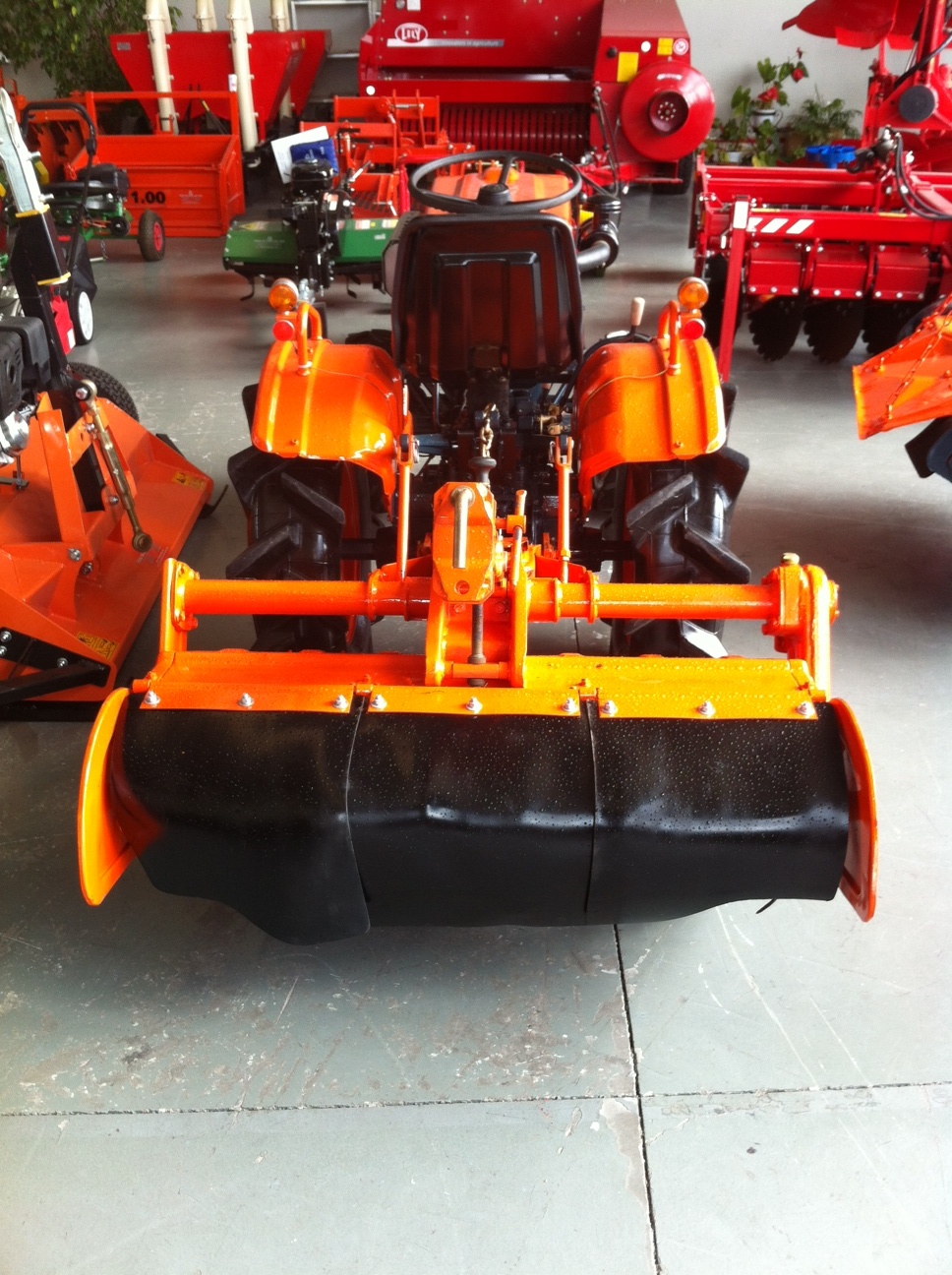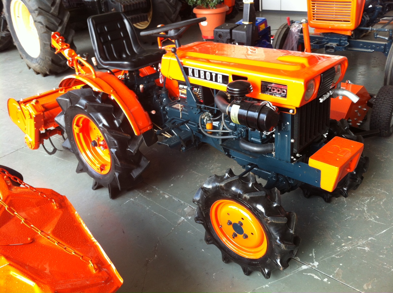 Minitractor de segunda mano Kubota B 7000 DT con rotavator de 110 cm de anchura de trabajo, tractor diesel de 2 cilindros y 20 CV de potencia.