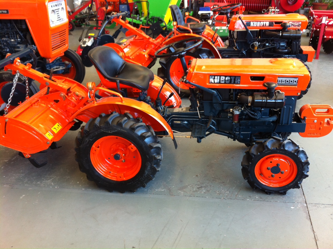 Minitractor de segunda mano Kubota B 5000 DT con rotavator de 90 cm de anchura de trabajo, tractor diesel de 2 cilindos y 17 CV de potencia.