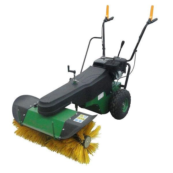Barredora autopropulsada con motor de gasolina 6 CV, ancho de trabajo 80 cm, ruedas hinchables, regulación de altura de trabajo e inclinación de barrido, 5 velocidades, velocidad de trabajo de 2 a 5 km/h, arranque eléctrico a 220V o manual.